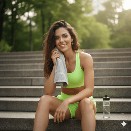 Retrato de una influencer de IA sonriente y sudorosa, sentada en unas escaleras de hormigón después de correr. Se está secando la frente con una toalla, tiene una botella de agua al lado. Luz suave de la mañana, bokeh de fondo de un parque verde, mirada directa a la cámara, aspecto saludable y satisfecho. Fotografía de estilo de vida, lente de 50mm, alta definición.