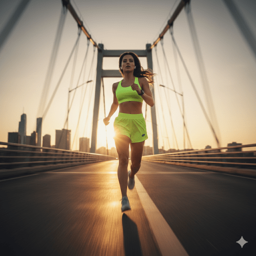 Fotografía de acción de una influencer de IA atlética corriendo a toda velocidad por un puente de una ciudad moderna al amanecer. Desenfoque de movimiento en el fondo, expresión de determinación, lleva auriculares inalámbricos y ropa de running de color neón. Ángulo bajo dinámico, luz cálida del sol naciente, estilo cinematográfico, fotorrealista, 8K.