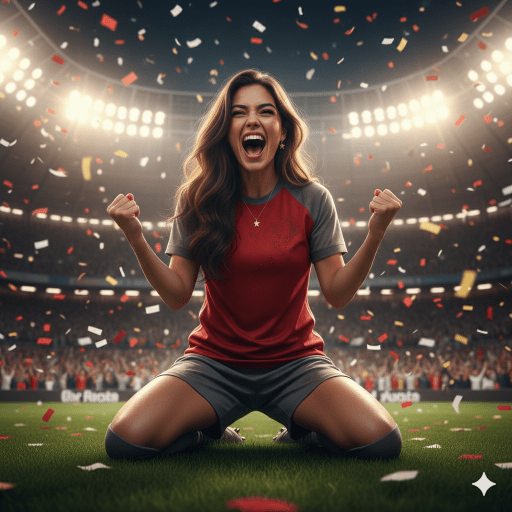 Fotografía de ángulo bajo de una futbolista influencer de IA celebrando un gol con euforia en un estadio profesional lleno de gente. Rodillas en el suelo, puños en alto, gritando de alegría. Los focos del estadio crean un contraluz dramático, confeti en el aire. Fotorrealismo extremo, captura de alta velocidad, detalles de la textura de la camiseta y el césped.