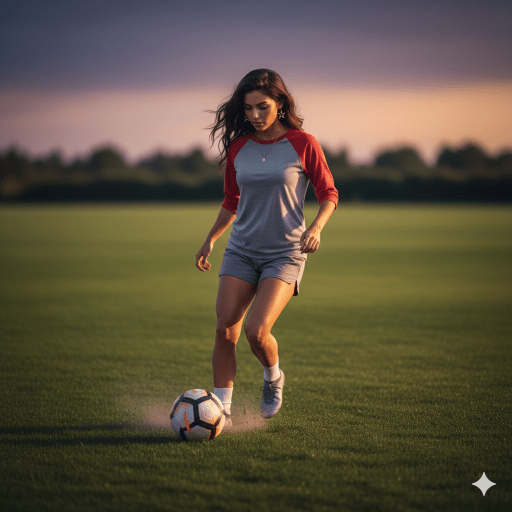 Influencer de IA femenina practicando regates con un balón de fútbol en un campo de entrenamiento vacío. Atardecer, largas sombras en el césped. Máxima concentración en su rostro, movimiento congelado mientras el pie toca el balón. Estilo documental deportivo, luz natural, colores vibrantes.