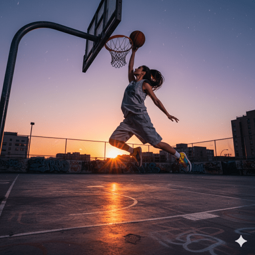 Fotografía de acción dinámica de una influencer de IA realizando un mate en una cancha de baloncesto callejera. El sol se está poniendo, creando siluetas y reflejos en el suelo. Estilo "street style", lleva zapatillas de baloncesto de edición limitada y ropa holgada. Captura de alta velocidad, ángulo contrapicado para enfatizar la altura del salto, fotorrealista con grano de película.