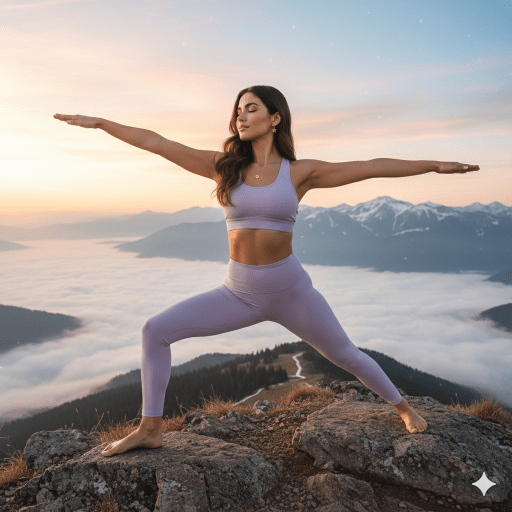 Influencer de IA realizando la postura del guerrero en la cima de una montaña con vistas a un valle neblinoso al amanecer. Ropa de yoga cómoda, ojos cerrados en meditación, atmósfera pacífica y serena. Gran angular para capturar el paisaje majestuoso, colores suaves y pastel, iluminación etérea, fotorrealista.