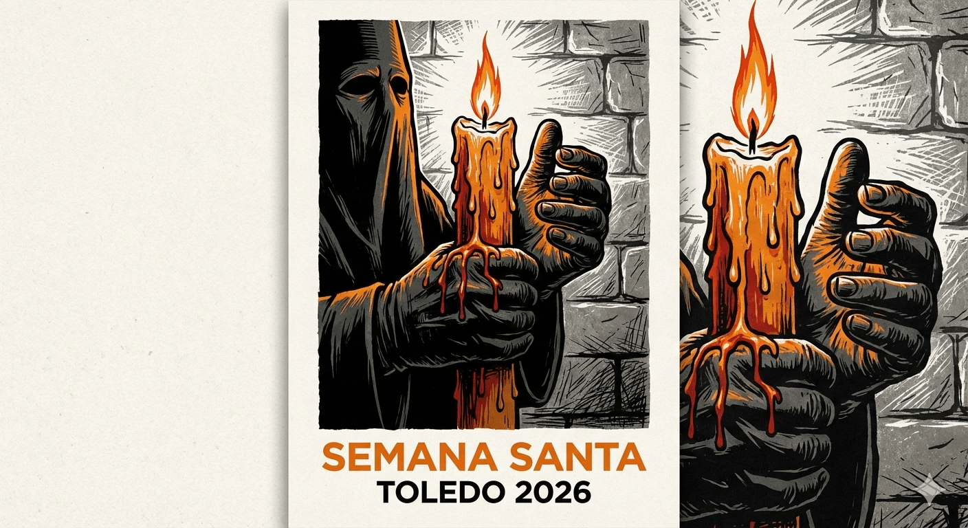 - Tipografía: Moderna, de palo seco (sans-serif), muy limpia. El texto «SEMANA SANTA» en grande y en blanco o rojo. Debajo, más pequeño, «TOLEDO 2026». La tipografía se integra con la verticalidad del cirio.