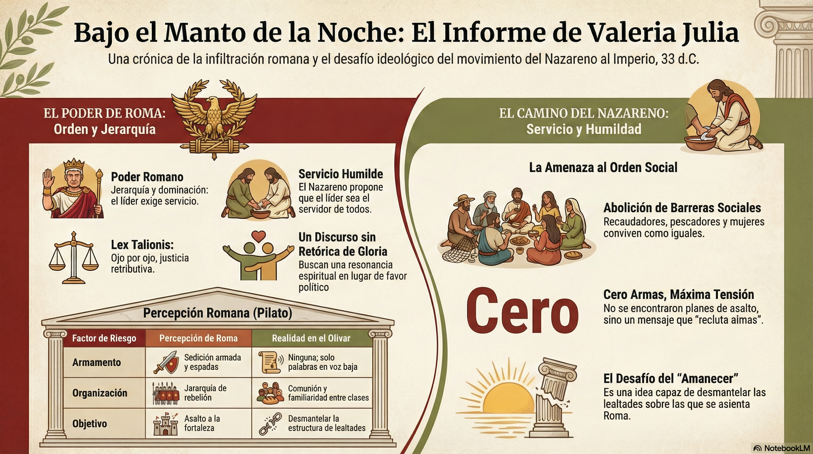 Nuestra enviada, Valeria Julia, nos ha dejado una advertencia clara: no busquéis en el Huerto de los Olivos acero ni planes de sedición militar; el verdadero peligro para el Águila no reside en el filo de una espada, sino en la profundidad de una idea que busca reclutar almas en lugar de soldados. Si el orden de nuestra civilización se basa en la jerarquía inamovible y el cursus honorum, este mensaje que ensalza al servidor y predica el amor al enemigo representa el desafío más radical que ha enfrentado el Imperio en Oriente.