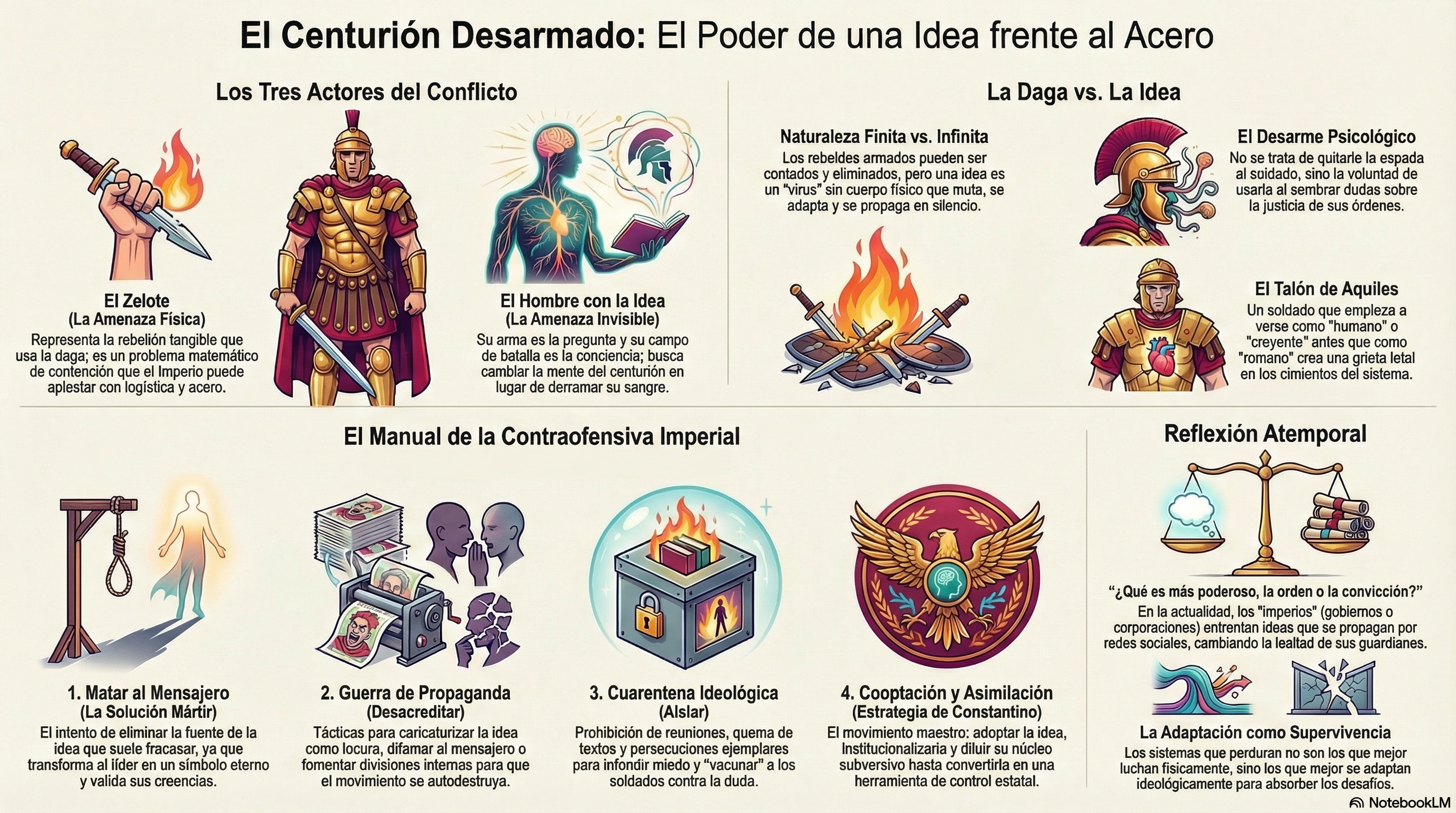 Esta lección es atemporal. Hoy, los «imperios» pueden ser gobiernos, corporaciones multinacionales o sistemas ideológicos arraigados. Las «dagas de los zelotes» son las protestas físicas y los actos de sabotaje, visibles y ruidosos. Pero las «ideas que desarman centuriones» se propagan silenciosamente a través de internet y las redes sociales, cambiando la lealtad de aquellos que se supone deben proteger el sistema.