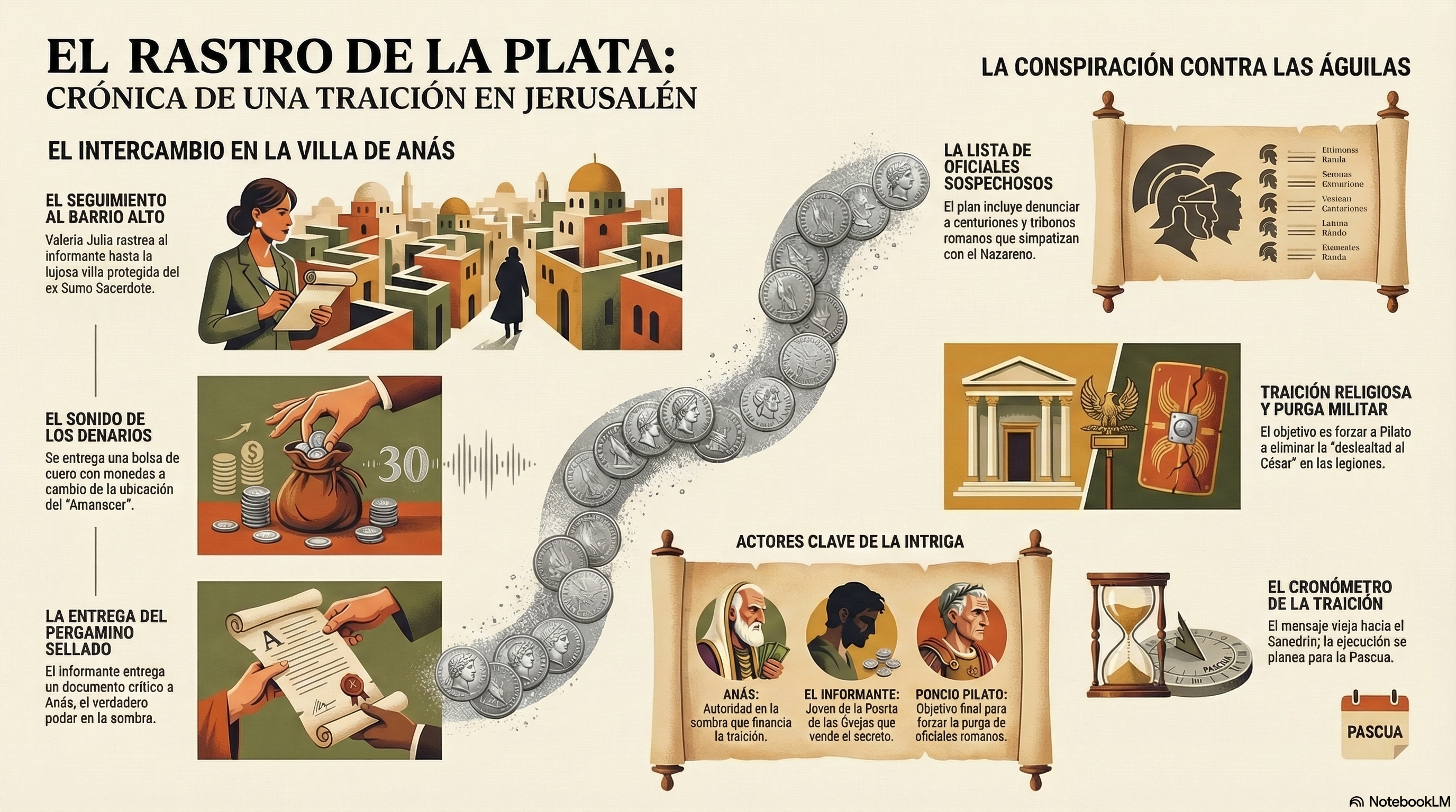 El pago de las «treinta monedas de plata» (que tradicionalmente se asocian con siclos de Tiro o denarios romanos) tiene una carga simbólica y legal: era el precio de compensación por un esclavo herido según la antigua ley. Al pagar esa cantidad, Anás está enviando un mensaje humillante: para la élite de Jerusalén, el Nazareno tiene el valor de un siervo. Valeria Julia detecta con precisión que lo que se ha comprado es la geolocalización del reo para evitar un tumulto público.
