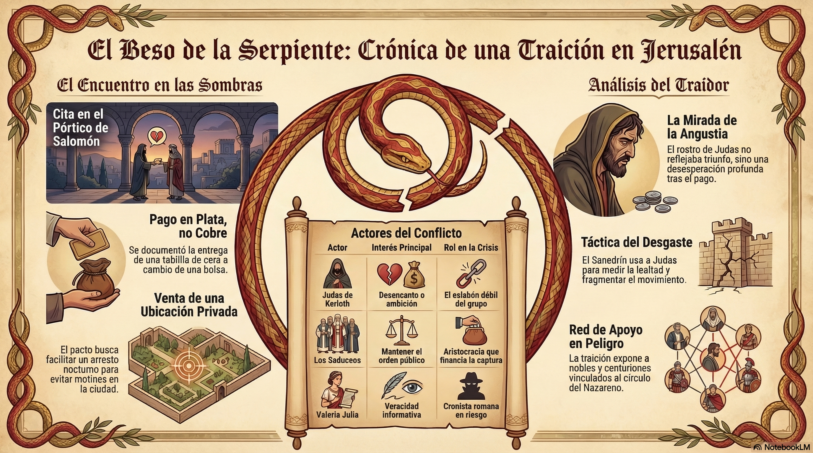 - El Motivo: Los Saduceos, aristocracia sacerdotal interesada en mantener el orden, temen un arresto público que provoque un motín. Judas les ha vendido lo único que necesitaban: una ubicación privada —un huerto o casa oculta— para actuar bajo el amparo de la noche.