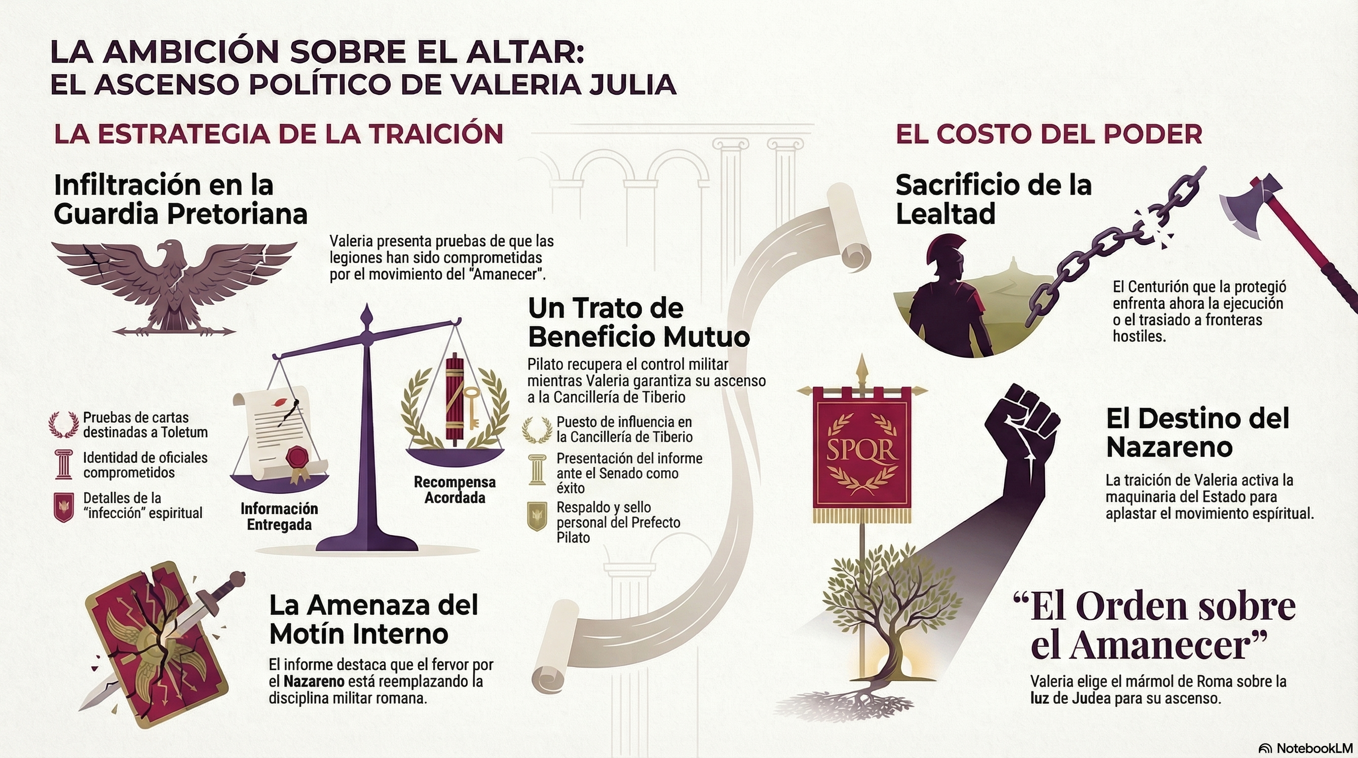 - ¿Ha traicionado Valeria a sus nuevos amigos para recuperar su gloria en Roma, o es esta la única forma de que Pilato actúe y, paradójicamente, disperse al grupo antes de que el Sanedrín los ejecute? ¿Prevalece el Águila sobre el Olivo en el corazón de nuestra cronista?