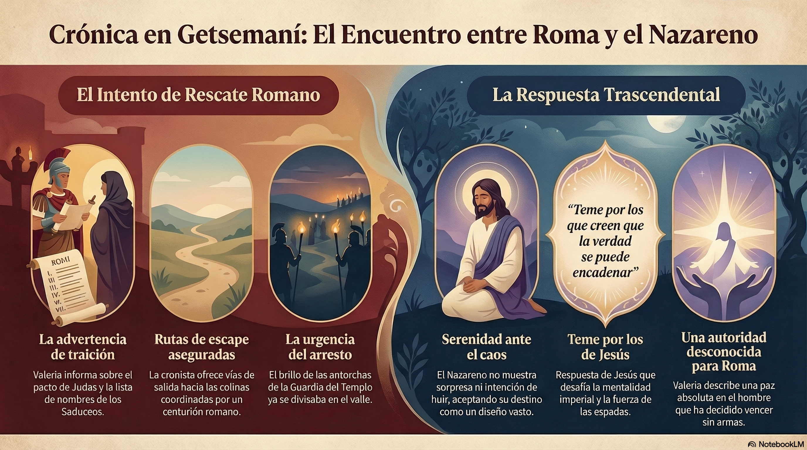 - El Dilema de Valeria: Nuestra cronista se encuentra ante un hombre que se niega a ser salvado. Valeria le ha ofrecido las rutas de escape que el Centurión ha asegurado, pero el Nazareno parece esperar el beso de la traición como quien espera la aurora.