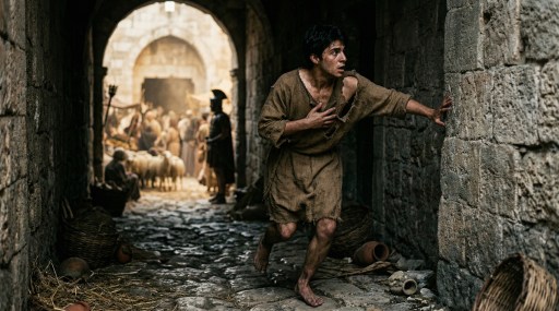 HIEROSOLYMA – El estruendo en el Pretorio es ensordecedor. Los gritos de «¡Crucifícalo!» rebotan en las paredes de piedra, creando un eco que parece sacudir los cimientos de la ciudad. Sin embargo, me he alejado del epicentro del juicio. Mi instinto me ha llevado de vuelta a los alrededores de la Puerta de las Ovejas, buscando un rastro de humanidad entre tanta furia política.