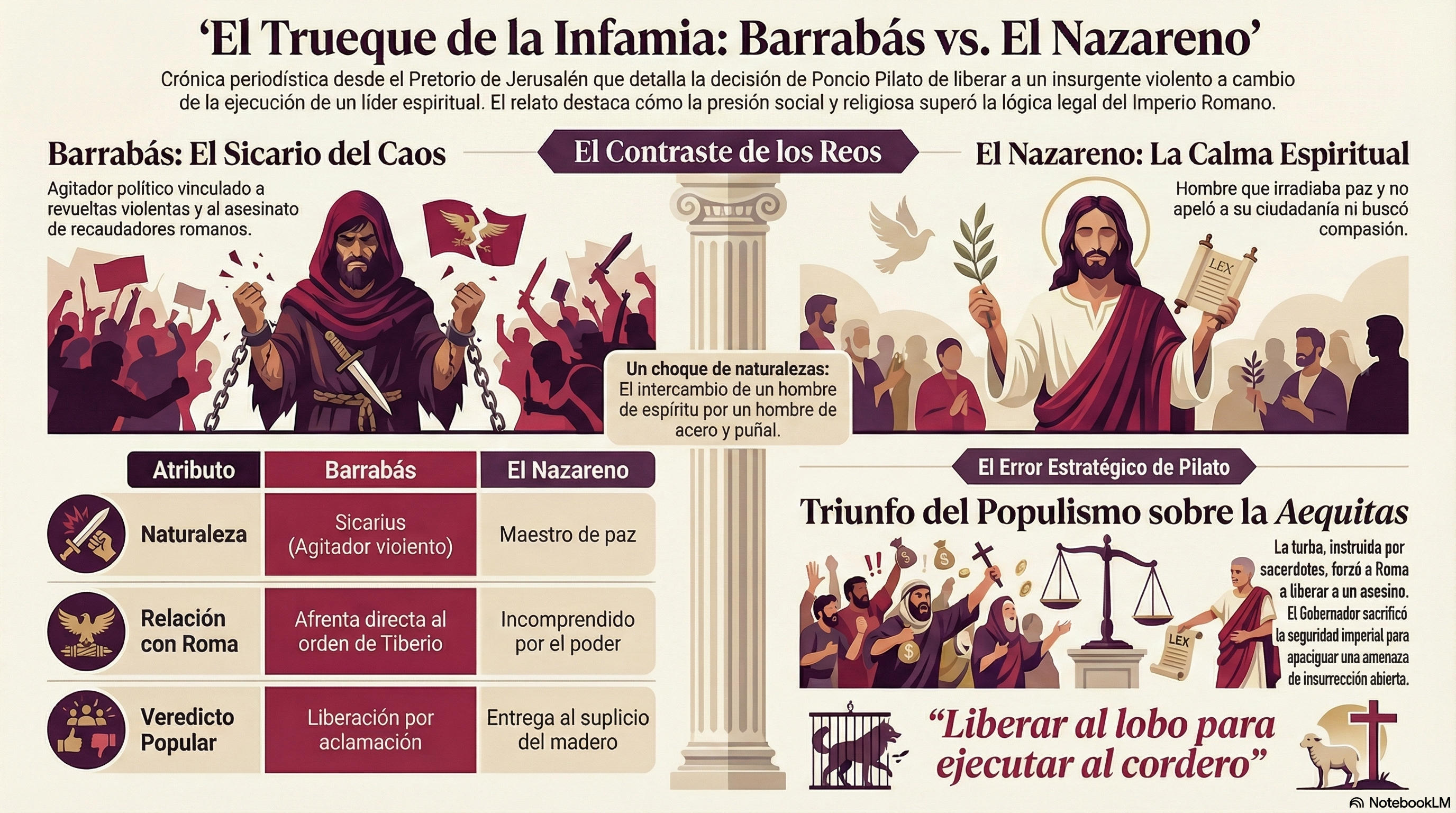 - El testimonio de Valeria: Al dar fe de que no hay «actividades militares», Valeria intenta desmontar la acusación de sedición política. Sin embargo, Pilato utiliza la figura de Barrabás como un último intento de salvar a Jesús mediante el favor popular. Al fallar esto, la justicia romana se convierte en un simple instrumento de orden público.