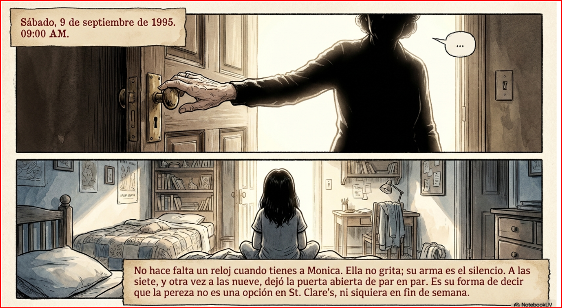 Superada esta pequeña fricción matutina, la estructura del día se impondrá con su calma habitual. No espero mayores incidentes y, desde luego, no me aburriré. Mi papel, en ausencia de Ana, no es ser su amiga, sino ser su ancla. Estas reglas, estas batallas silenciosas, no son castigos. Son la garantía de que, sin importar las tormentas internas de cada una, St. Clare’s permanecerá firme.