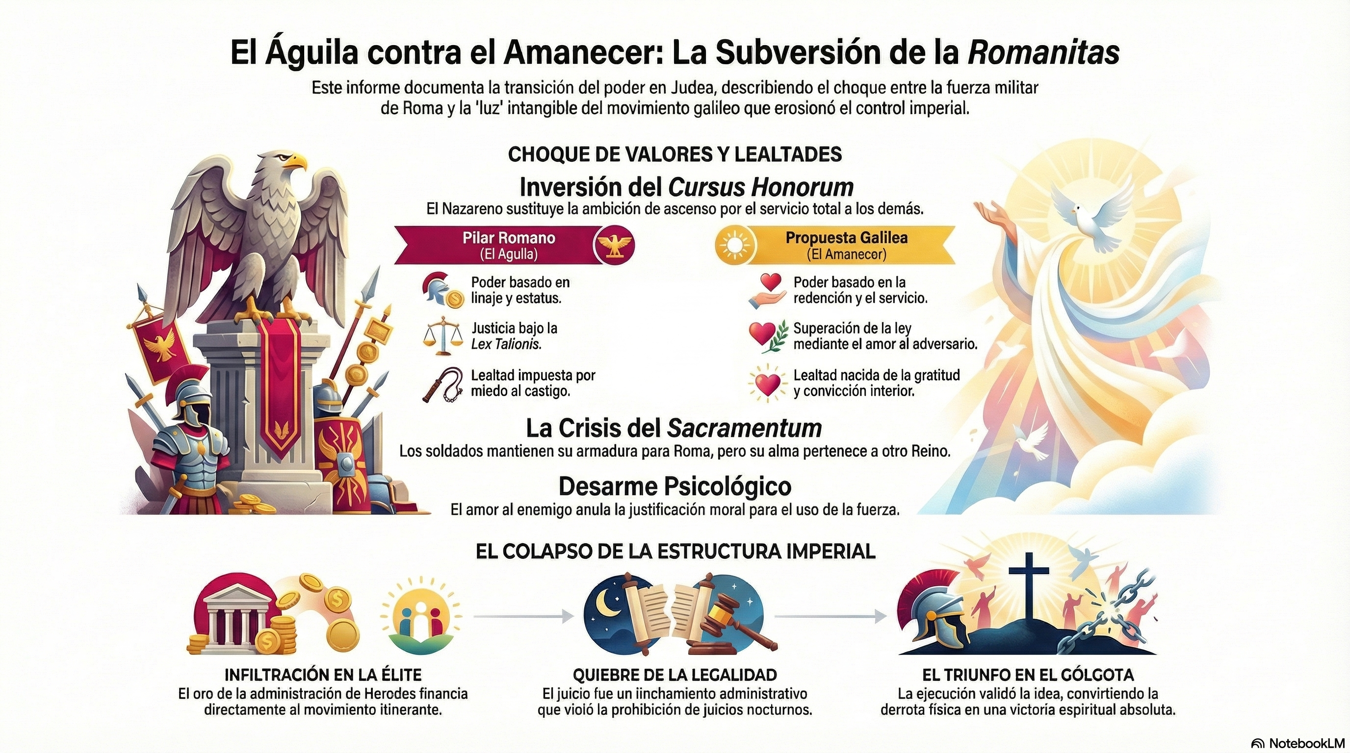 César, antes de partir hacia Ostia, mi advertencia es solemne: Roma ha perdido esta batalla. Podéis crucificar el cuerpo, pero habéis sido derrotados por la idea. El «Amanecer» no ha sido sofocado con los clavos del Pretorio; ha sido sembrado en el polvo de Judea y en el corazón de vuestras propias legiones.Roma es maestra en el orden visible —leyes, calzadas y castigos—, pero este movimiento ofrece el «sentido» de ese orden, algo que el mármol no puede otorgar. Si un oficial de alto rango admite que su alma ya no pertenece al Estado, nuestras murallas son ya estructuras vacías. El sacrificio en el Gólgota ha validado el mensaje: el Nazareno está ganando de una forma que vuestros generales no alcanzan a comprender.Valete , ciudadanos. La historia ya no pertenece a los archivos de mármol; ha comenzado a escribirse en la conciencia de los hombres.