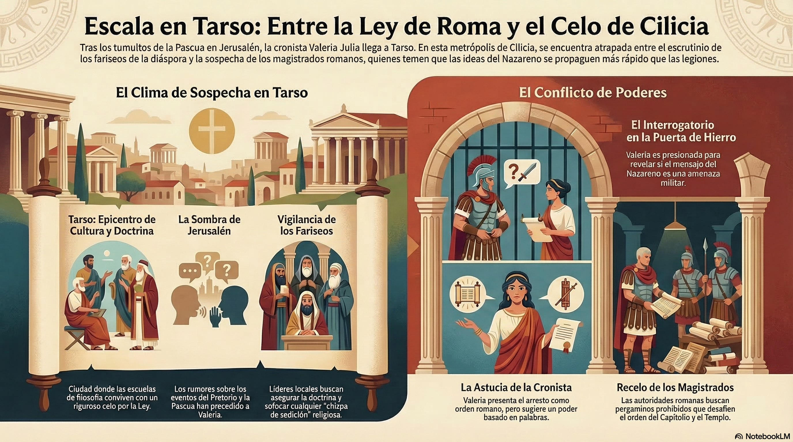 - El interrogatorio de los doctores En una audiencia privada cerca de la Puerta de Hierro, los fariseos de Tarso —hombres de la misma escuela que el joven Saulo— han presionado a Valeria. Quieren saber si el «fuego de la sedición» ha sido apagado del todo o si ella lleva consigo chispas que puedan incendiar las sinagogas de Cilicia.