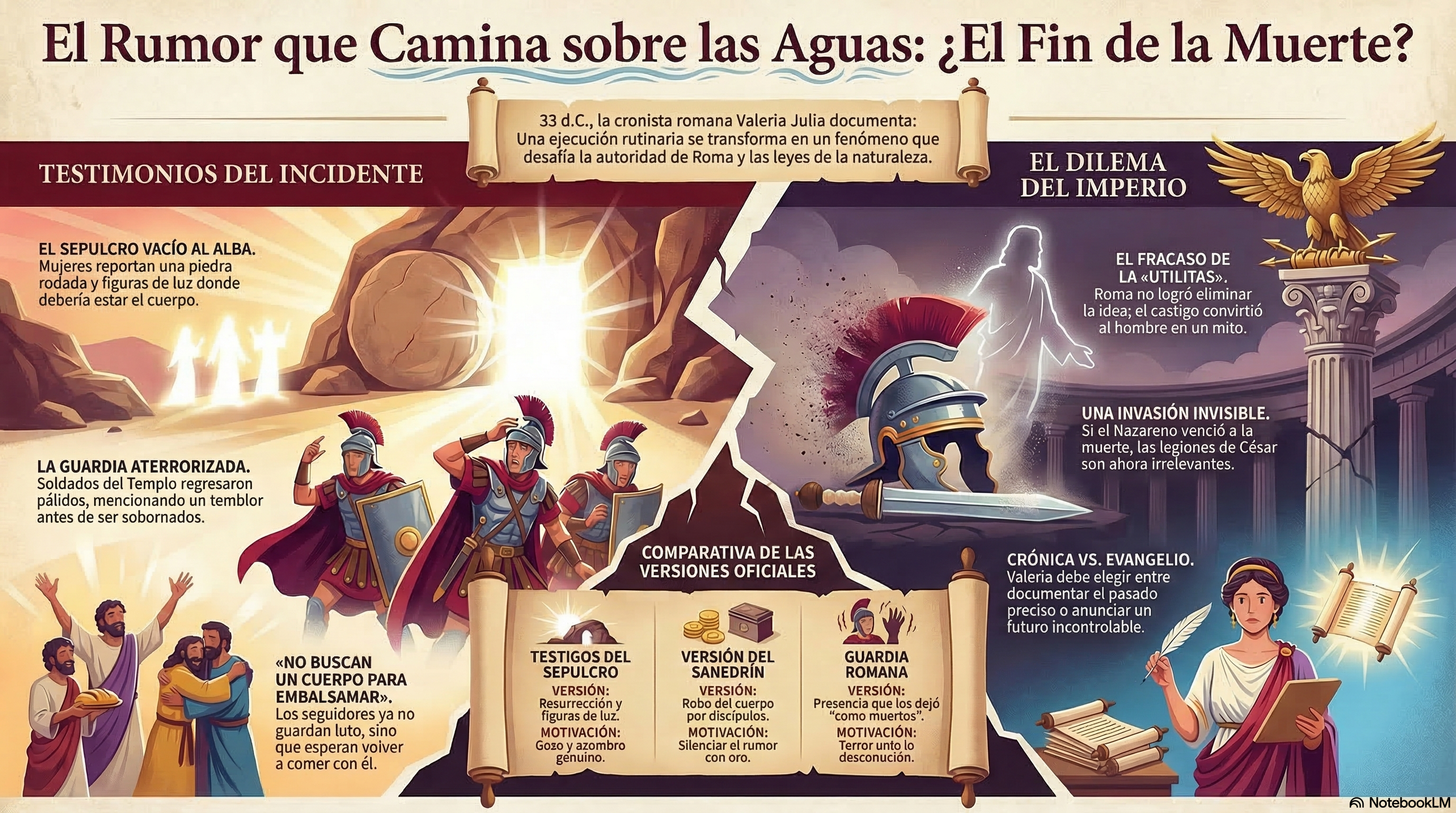 - La Ciudad en Suspenso: Jerusalén es una olla a presión. Los soldados de Pilato patrullan con más nerviosismo que de costumbre. Valeria anota: «Si este rumor se confirma, la ejecución del Gólgota no fue el final de una revuelta, sino el inicio de una era que Roma no podrá gobernar con legiones».