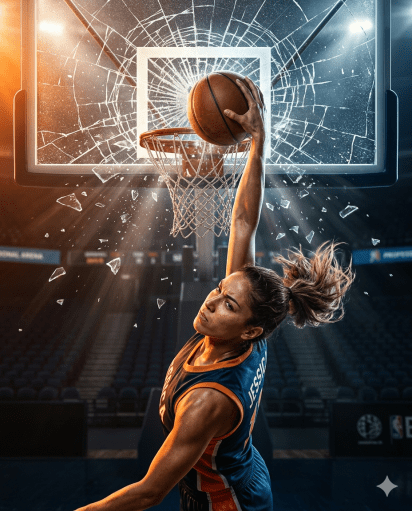 >low-angle shot of a basketball player dunking with explosive energy, shattered backboard glass effect, dramatic lighting, intense facial expression, highly detailed --ar 4:5