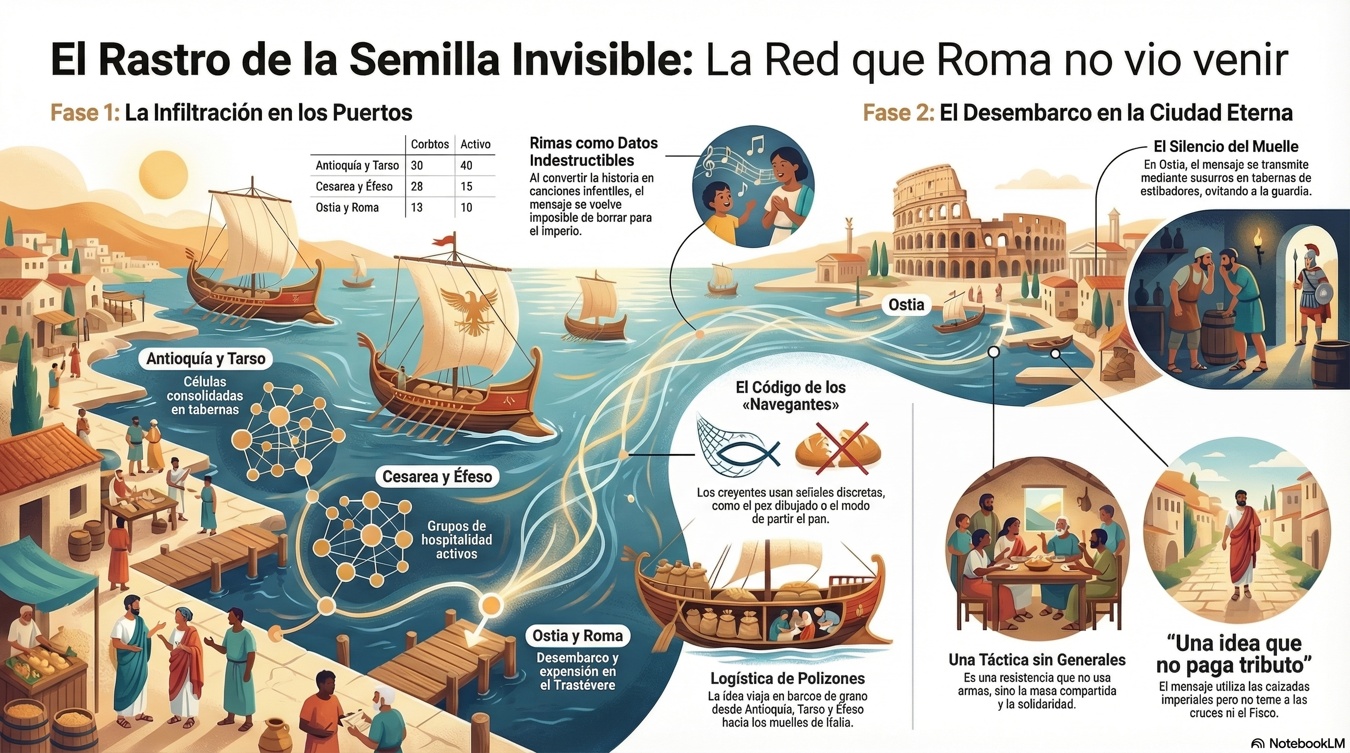 • La Red de los «Navegantes»: Valeria ha descubierto que existen ‘células’ o grupos de hospitalidad en cada gran puerto: Cesarea, Tarso, Éfeso y ahora Putéoli. Se reconocen por pequeñas señales —un pez dibujado en la arena, una forma de partir el pan—. La historia del Nazareno está viajando como polizón en los barcos de grano, infectando los muelles antes de que los gobernadores se enteren de su existencia.
