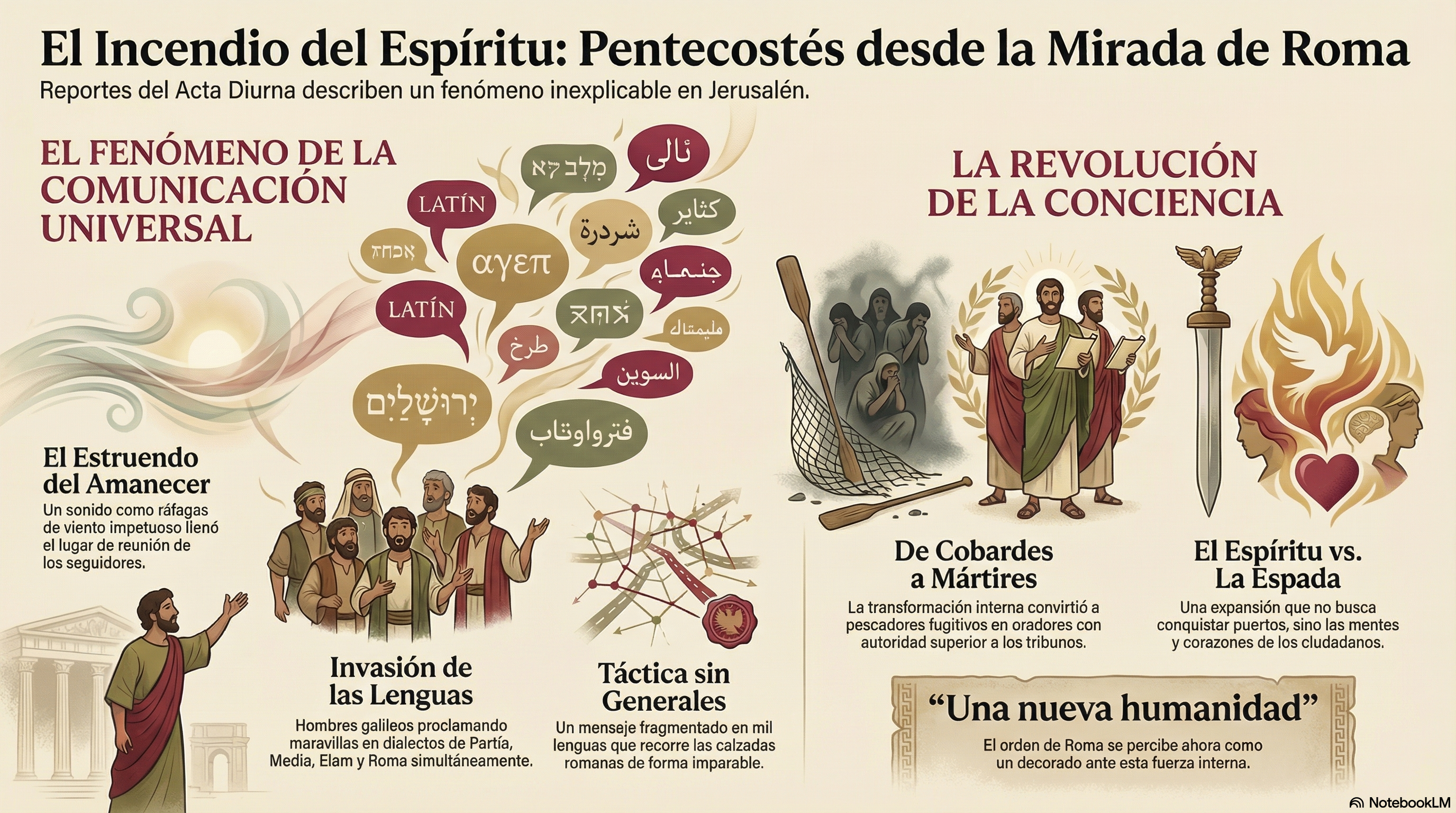 - La Lengua Universal: Hombres de Partia, Media, Elam y Roma los escuchaban en sus propias lenguas. La barrera que el Imperio intenta unir con calzadas y leyes, ellos la unían con un fuego que les bailaba en los ojos.
