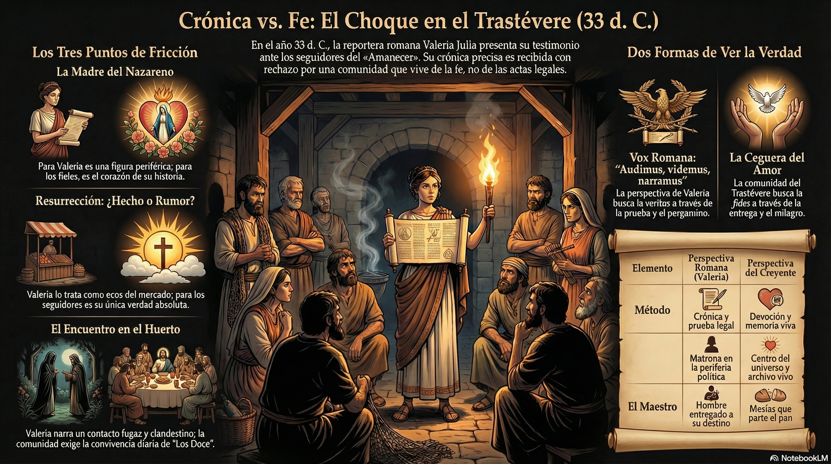 • Resurrección: ¿Hecho o rumor?: Aquí es donde la fricción es mayor. Valeria, fiel a su ética periodística, admite que lo que sabe sobre la Resurrección son voces recogidas en los puertos y mercados, ecos de Galilea que ella no puede certificar. Para los «navegantes» del Trastevere, esto no es un rumor, es su única verdad.