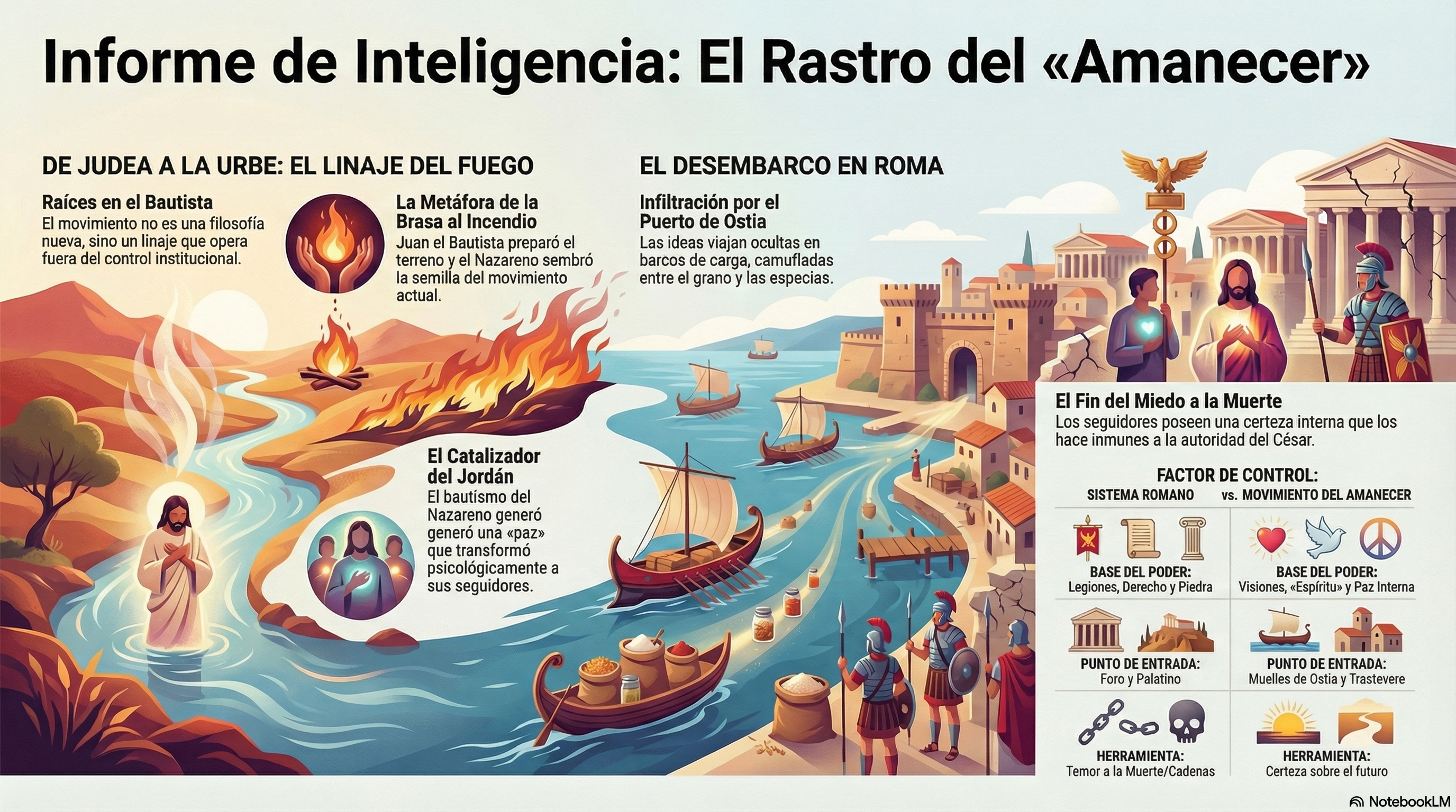 Bartimeo me reveló algo que Lucius Valerius sospechaba, pero no podía confirmar: el movimiento del Amanecer en Roma no es una invención nueva. Son las «brasas» que Juan el Bautista encendió en Judea, ahora convertidas en un incendio que cruza los mares. Juan preparó la tierra, el Maestro sembró la semilla, y ahora nosotros, los que quedamos, somos los que cuidamos el brote en medio de los lobos de la Urbe».