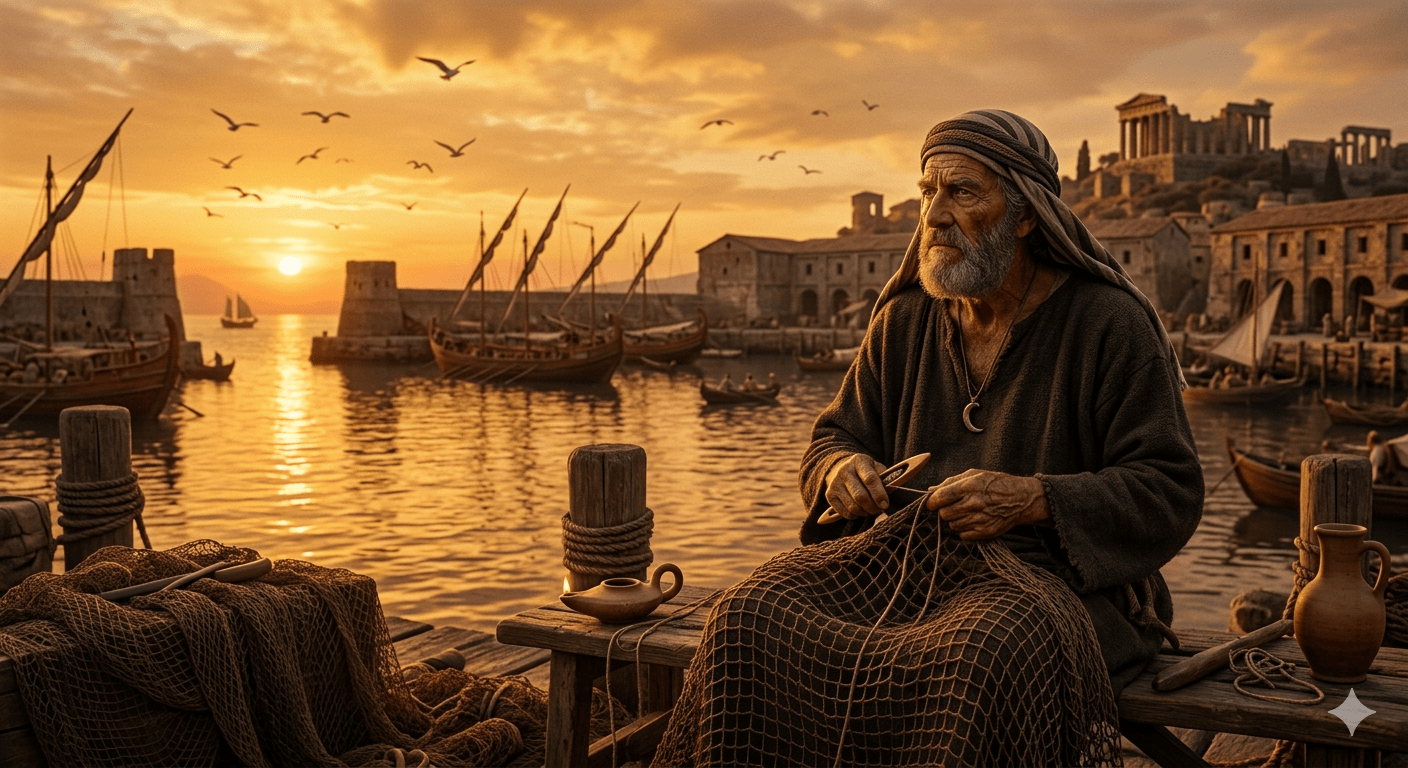 Lo encontré sentado sobre una red vieja, con la piel curtida como el cuero y unos ojos que parecían mirar más allá del horizonte del Mare Nostrum. Su nombre es Bartimeo, y me ha confesado, bajo juramento de silencio, que él estuvo allí. Él fue uno de los que dejó su hogar para seguir a Juan el Bautista en las riberas del Jordán.