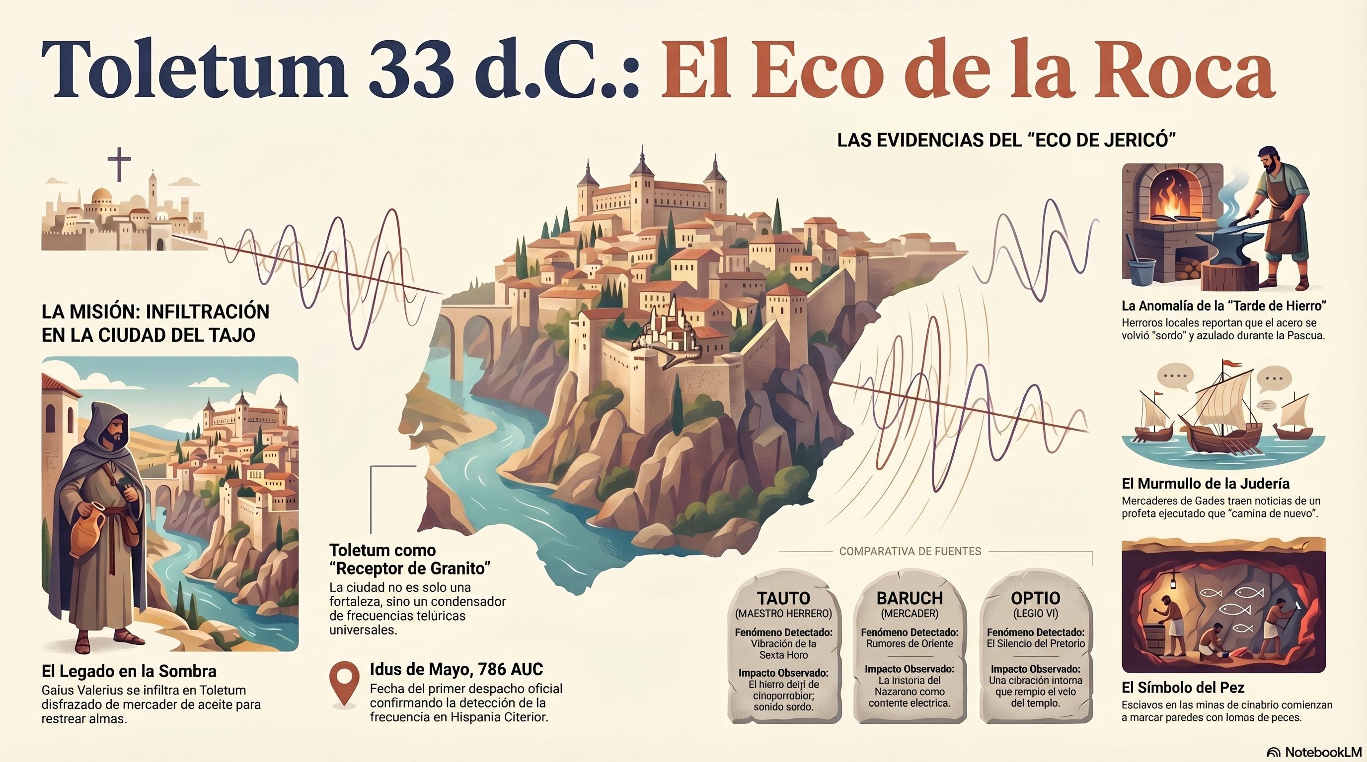 La llegada de Gaius a Toletum es un hito. Si Jerusalén fue el foco de la emisión, Toletum es el receptor de granito. Si la «Frecuencia de la Fuente» logra resonar en las cuevas y murallas de esta ciudad, significará que el Imperio Romano ha dejado de ser un sistema cerrado.