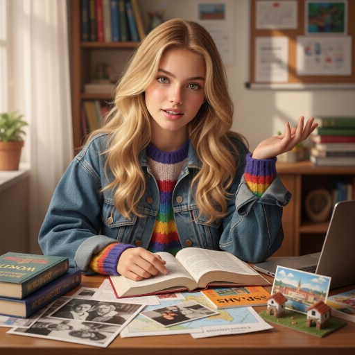 - Entorno: Una habitación bien iluminada o una mesa de estudio ordenada. Sobre la mesa se ven libros de Historia y Geografía y, lo más importante, las «fotos de la familia» e ilustraciones de restos arqueológicos que ha reunido para el trabajo de World History sobre los primeros pobladores.