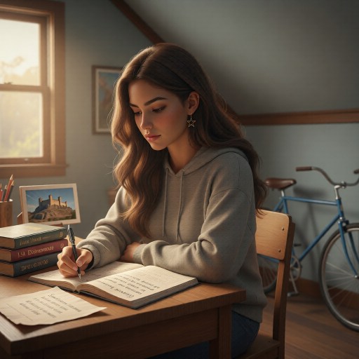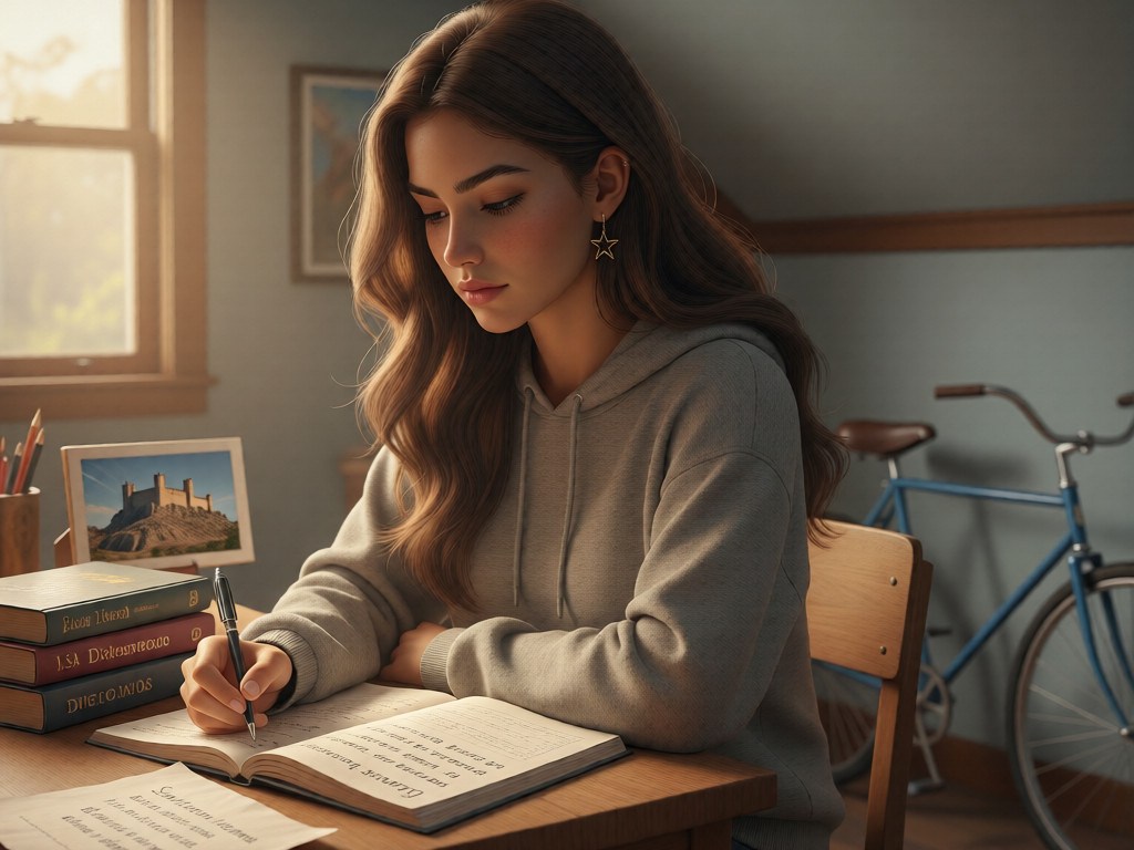 - Sujeto: Una joven de 14 años de apariencia sencilla, sentada en su escritorio en su habitación del St. Clare’s Home. Su rostro muestra una mezcla de melancolía y determinación silenciosa, con la mirada fija en su cuaderno de notas titulado «Llegada de los primeros humanos al continente americano».