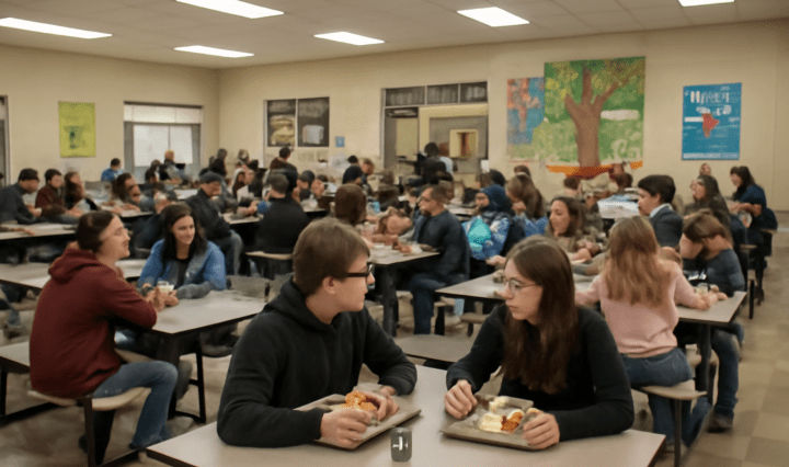 La cafetería escolar en Massachusetts es un espacio animado y funcional, ideal para la convivencia y descanso de estudiantes. Continúa leyendo Cafe en el MHS
