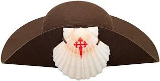 El sombrero de peregrino tradicionalmente tenía un emblema de concha de peregrino. Se cree que esto es una referencia a la leyenda cristiana de que, después de la muerte de Santiago en Jerusalén, fue llevado milagrosamente por ángeles a la costa atlántica de España, aunque el símbolo de la concha también se ha relacionado con las tradiciones precristianas.